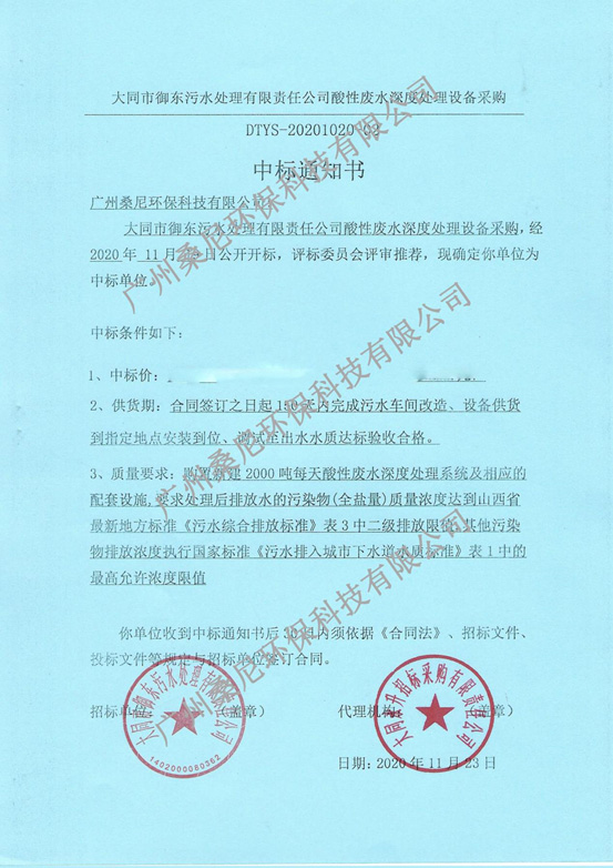 廣州桑尼環(huán)保科技有限公司參與酸性廢水深度處理設(shè)備采購項(xiàng)目投標(biāo),以良好的信譽(yù)、豐富的經(jīng)驗(yàn)、強(qiáng)大的技術(shù)實(shí)力以及專業(yè)的方案、合理的報(bào)價(jià)贏得了招標(biāo)單位以及評標(biāo)專家的肯定,成功中標(biāo)。